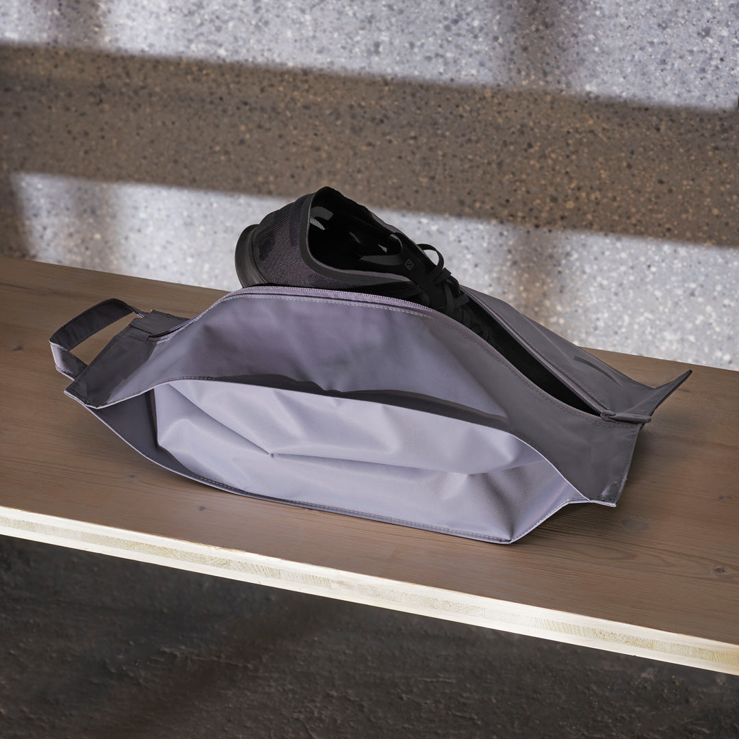 Lightweight and water resistant, the Émigré Shoe Bag doubles as a compact laundry bag.