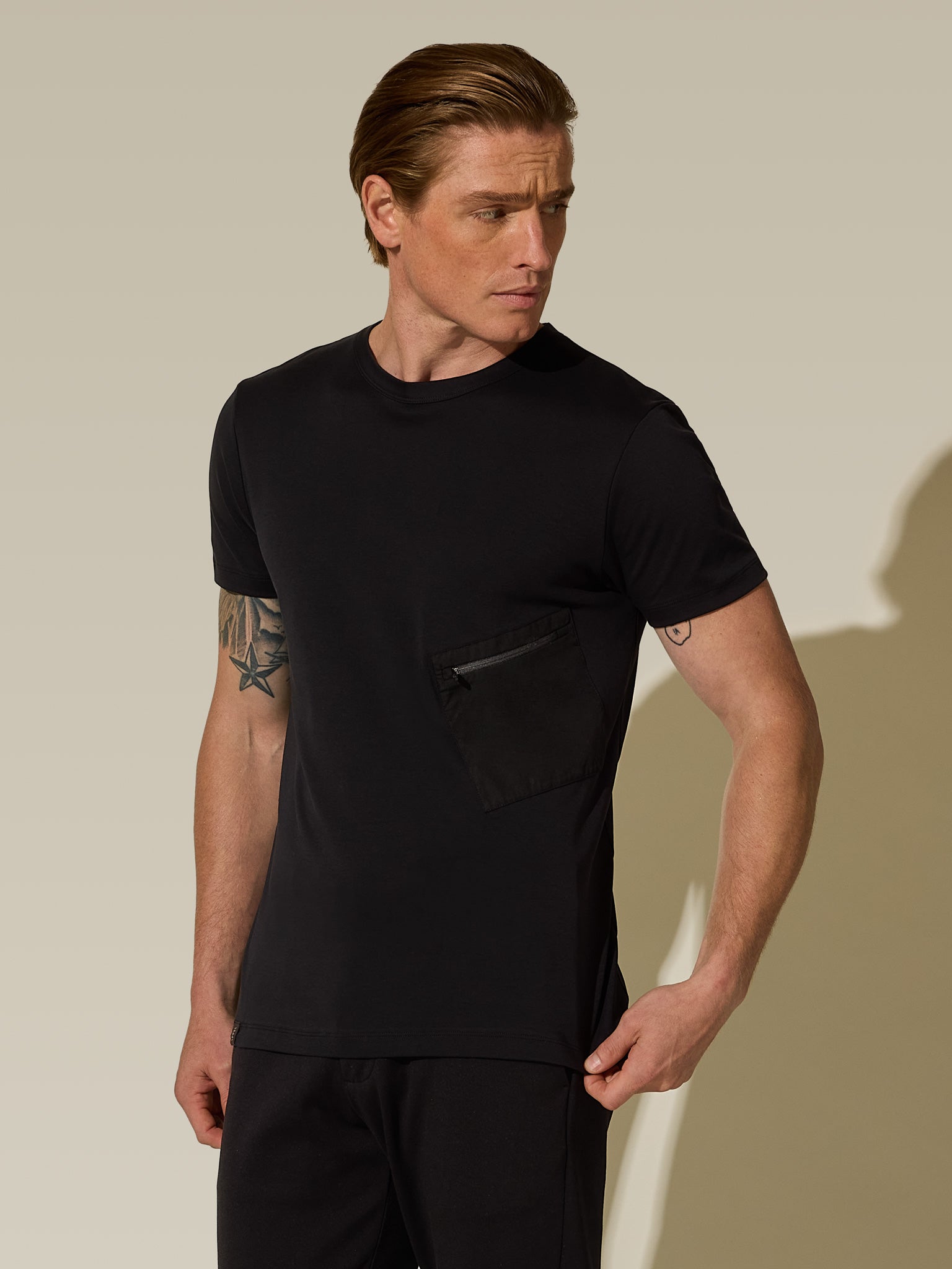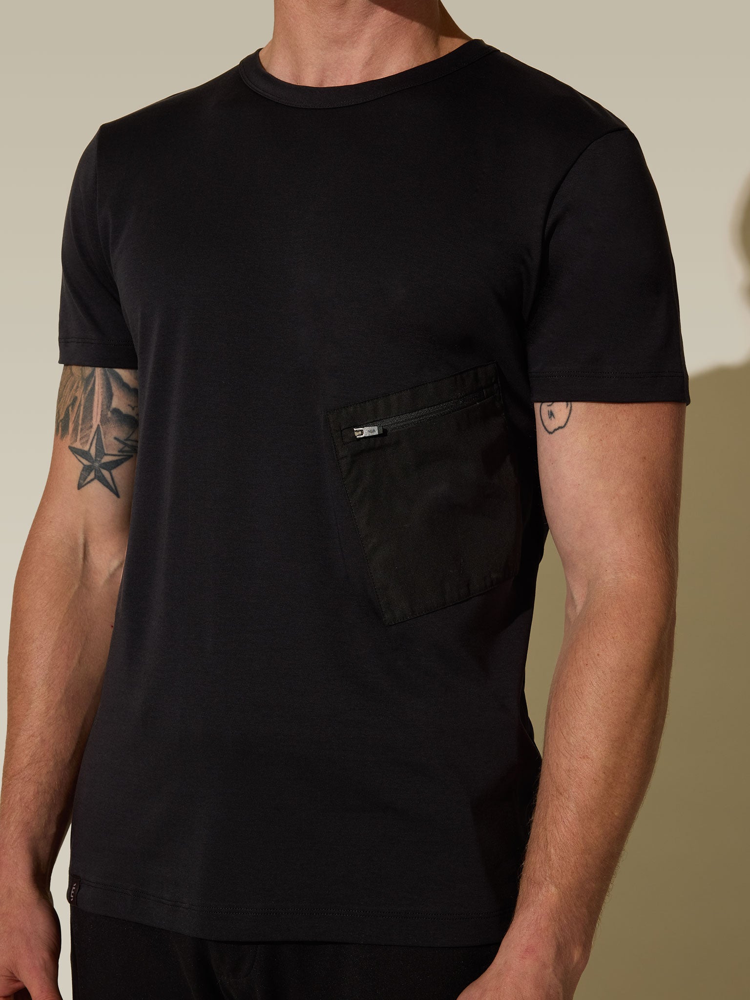 The Émigré One Pocket Travel Tee is crafted with 100% GOTS certified organic cotton. Featuring natural stretch, engineered side seams, and a cotton patch pocket with zipper closure to keep small items secure while on the move.