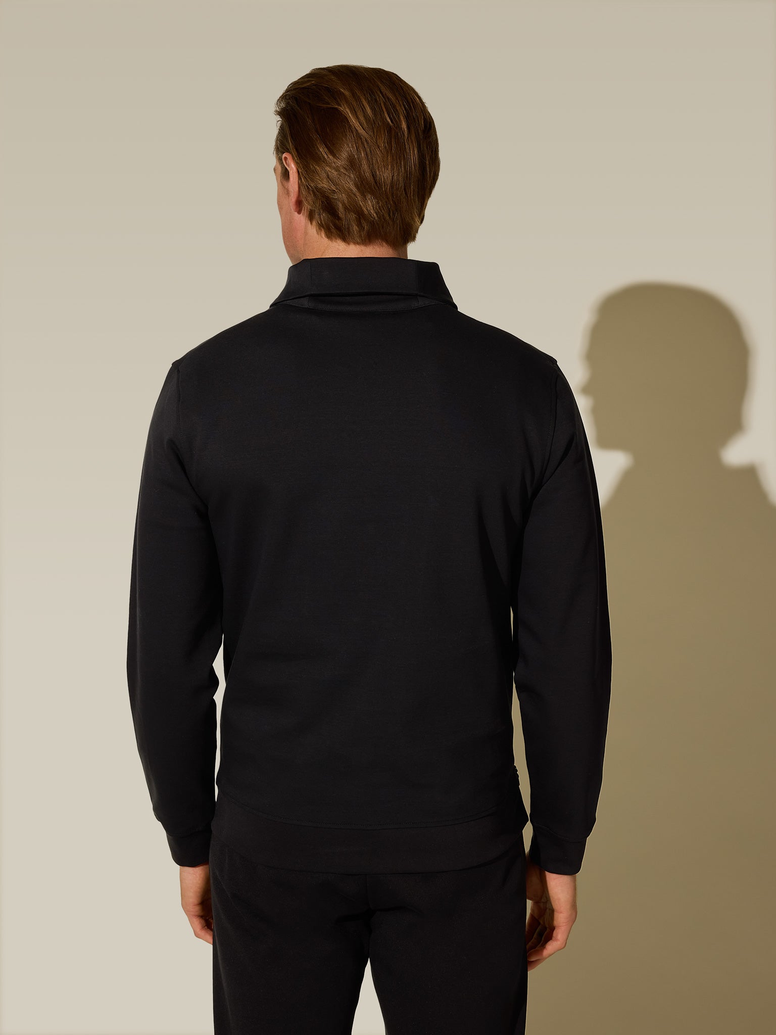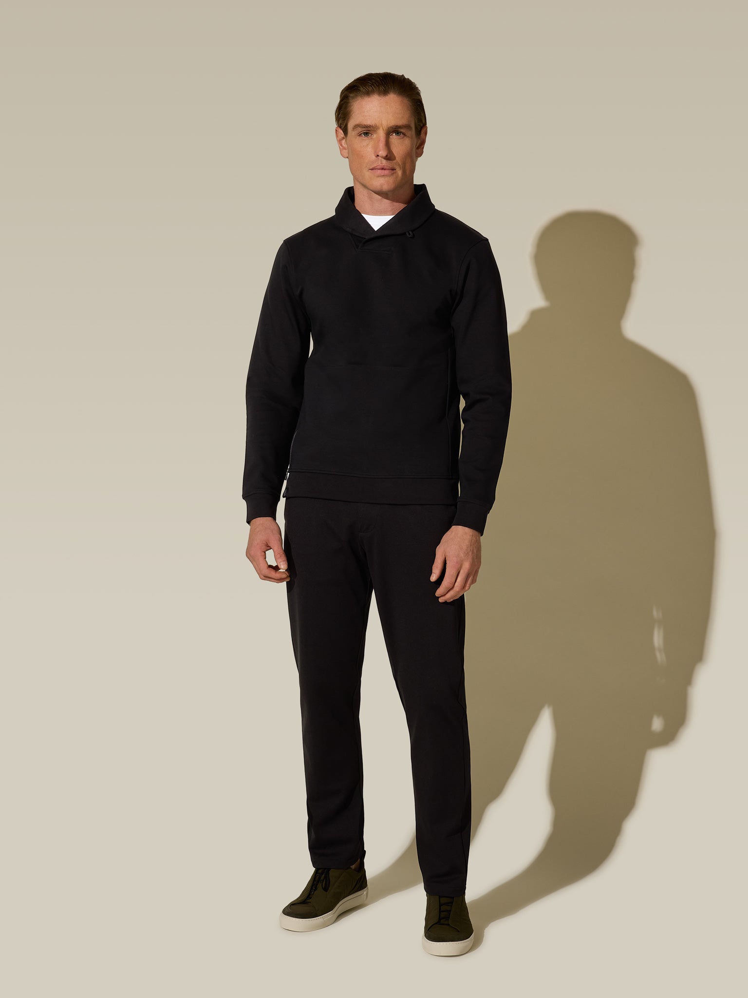 The Émigré Shawl Neck Popover is built for the modern professional on the move. Made from midweight organic double face cotton in a four way stretch blend, it features performance details such as a side zipper and internal kangaroo pocket. Layer with an Émigré Blazer or Woven Oxford Shirt.